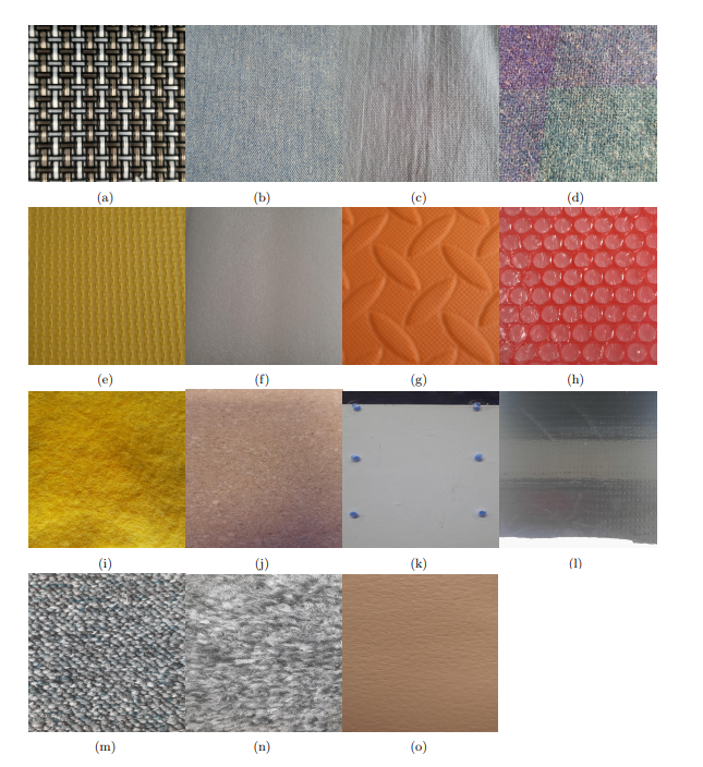 Perhaps understandably, most papers on tactile sensing for texture classification have used textured materials that are easily accessible, and to date no standard texture set has been created. Past texture sets are often of different sizes which hampers comparability because, as shown in section, some texture classifiers perform well when distinguishing between small numbers of textures but degrade sharply as the number of classes increase. As established current datasets tend to use items that appear in the labs of the researchers. Often these include some form of carpet, hard materials and fabrics. Our texture dataset was designed to try and include commonalities between previous sets and to represent a range of material properties that a walking robot may come into contact with, such as indoors or flat outdoors surfaces. These included soft/hard bodies, coarse/smooth surfaces and surfaces with raised aspects.